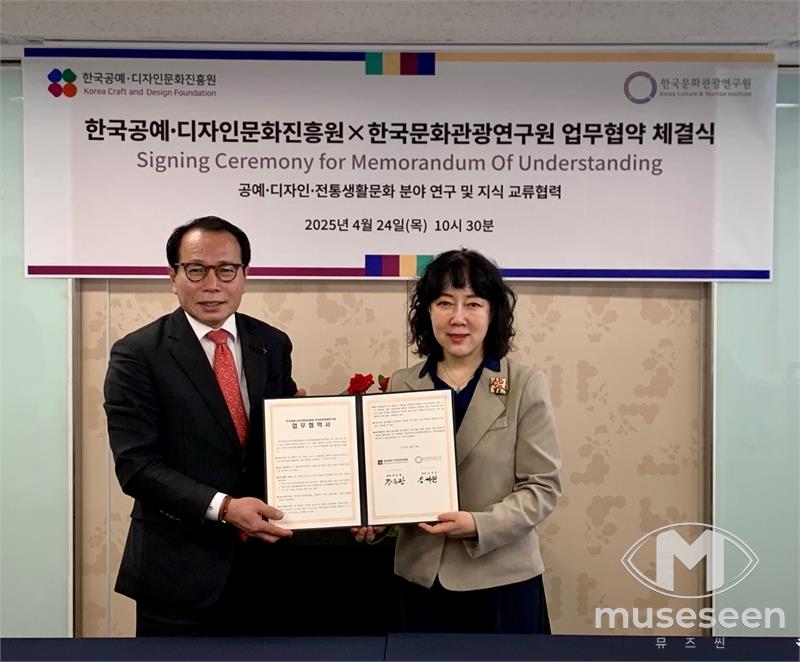 [뮤즈씬] 한국문화관광연구원(원장 김세원, 이하 연구원)과 한국공예·디자인문화진흥원(원장 장동광)은 24일 한국공예·디자인문화진흥원 5층 대회의실에서 ‘공예·디자인·전통생활문화 연구 및 지식 교류를 위한 업무협약’을 체결했다.이번 협약은 공예·디자인·전통생활문화 기반 상호교류를 위해 양 기관 간 △조사·연구, 정책정보·