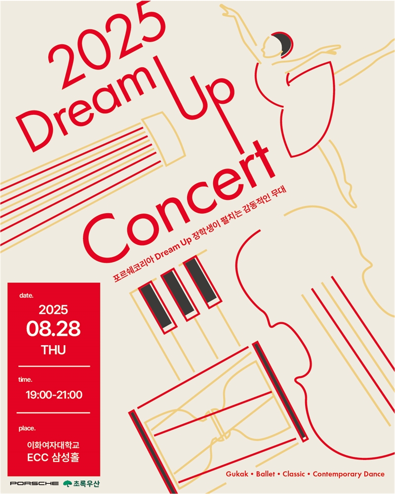 [뮤즈씬] 아동복지전문기관 초록우산과 포르쉐코리아가 함께하는 ‘2025 드림업 콘서트’가 오는 8월 28일(목) 오후 7시 이화여대 ECC 삼성홀에서 개최된다.올해로 2회째를 맞는 ‘드림업 콘서트’는 장학생들의 재능과 성장을 무대에서 선보이는 특별한 무대로, 초록우산 정기후원자와 일반 시민들에게 무료로 열린다. 올해는 규