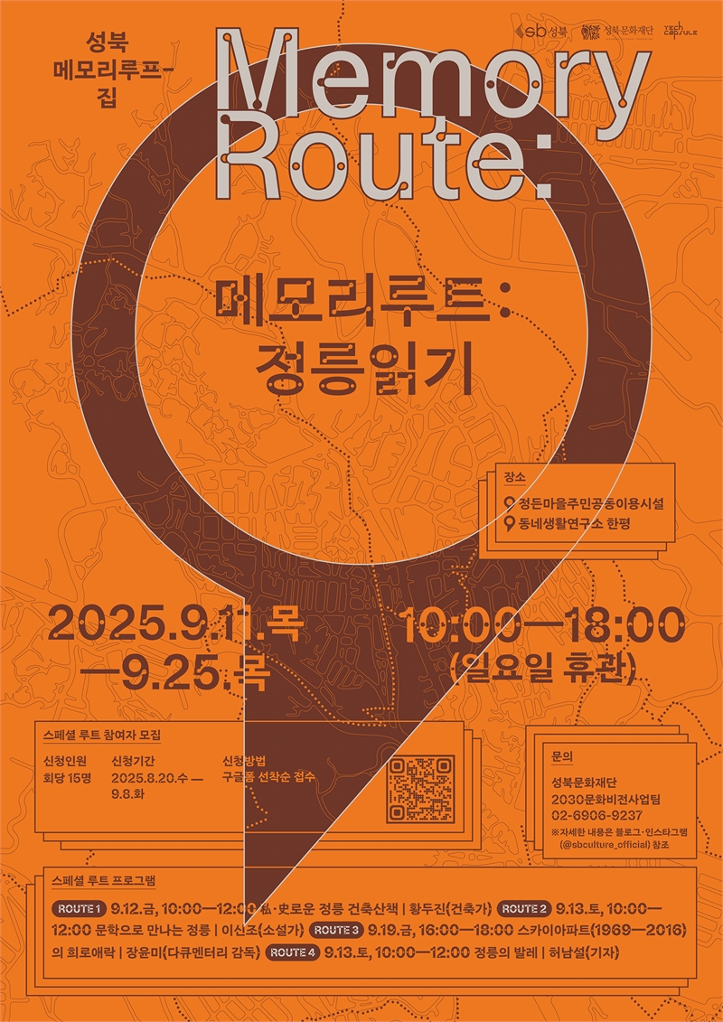 [뮤즈씬] 성북문화재단(대표이사 서노원)은 오는 9월 11일부터 25일까지 정릉 일대에서 답사형 공유 전시 ‘메모리루트: 정릉읽기’(이하 메모리루트)를 개최한다. 이번 전시는 2024년 발간된 아카이빙북 ‘정릉읽기’를 토대로 정릉의 주거지 변화와 장소성, 그리고 그 속에 스며든 문화예술의 흔적을 걸으며 사유하는 방식으로