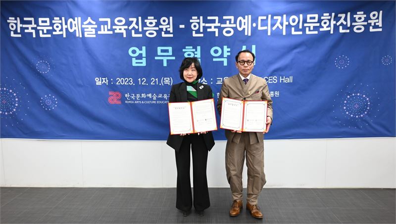 [뮤즈씬] 한국문화예술교육진흥원(원장 박은실, 이하 교육진흥원)은 한국공예·디자인문화진흥원(원장 장동광, 이하 공진원)과 문화예술교육 콘텐츠 프로그램 공동 개발 및 확산을 위한 업무협약(MOU)을 21일 서울 마포구 상암동에 위치한 교육진흥원 본원에서 체결했다.