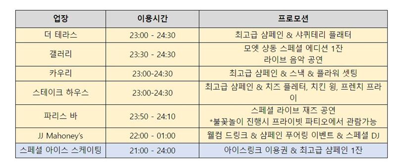 해당 이벤트는 12월 31일 단 하루 이용 가능하며 오후 9시부터 자정까지 진행된다. 각 업장별 이용 시간 및 프로모션에 대한 자세한 문의 및 예약은 호텔 대표번호 02-797-1234 또는 홈페이지를 통해 예약 가능하다.