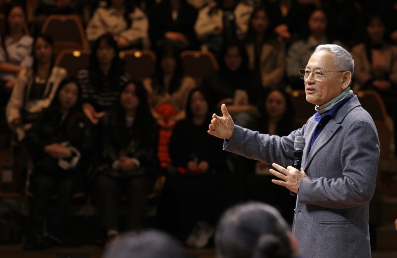 유인촌 문화체육관광부 장관이 서울 중구 국립극장 하늘극장에서 열린 '국립예술단체 청년 교육단원 통합 발대식'에서 청년 교육단원들과 대화의 시간을 갖고 있다. 문화체육관광부