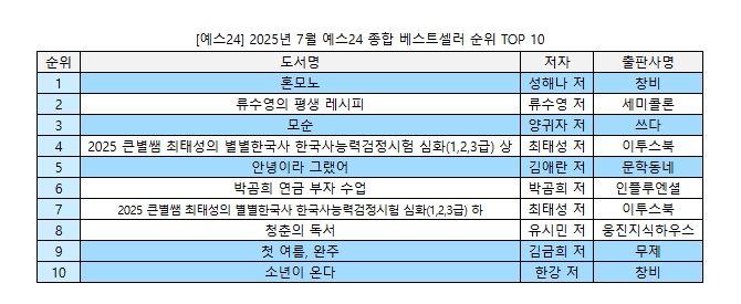 예스24 7월 종합 베스트셀러 분석 시, 10위권 내 한국 소설이 무려 5권이나 자리했다.